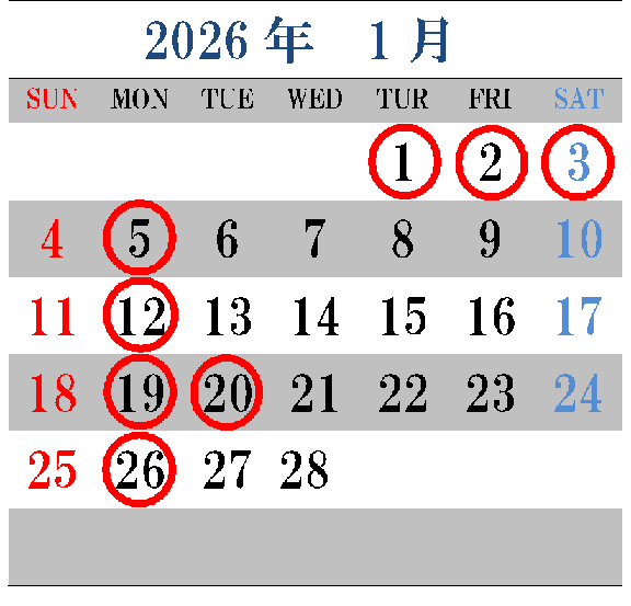 12・1月の定休日のお知らせ!! 2025/12/05 NEWS 12月の定休日のお知らせです! 赤い丸印〇が定休日となっております 今月も宜しくお願い致します(^^)/ 1月のお知らせは、下に掲載しております
