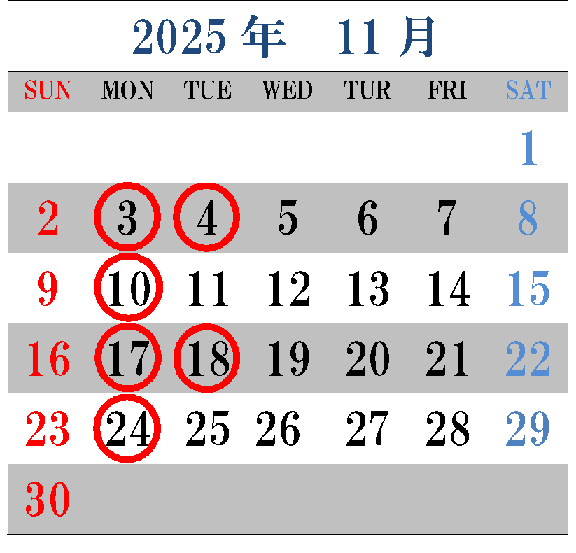 10・11月の定休日のお知らせ! 2025/09/25 10月の定休日のお知らせです! 赤い丸印〇が定休日・お盆休みとなっております 今月も宜しくお願い致します(^^)/ 11月のお知らせは、下に掲載しております
